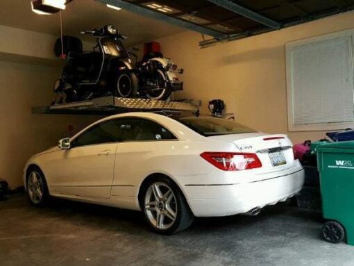 The ML-2000 take up less room in your garage, while creating amble space for other garage activities. and runs on a 110V power unit. The ML-2000 comes with 3 removable center Aluminum Deck Inserts (54″ W x 21″ D), six drive-on aluminum ramps.