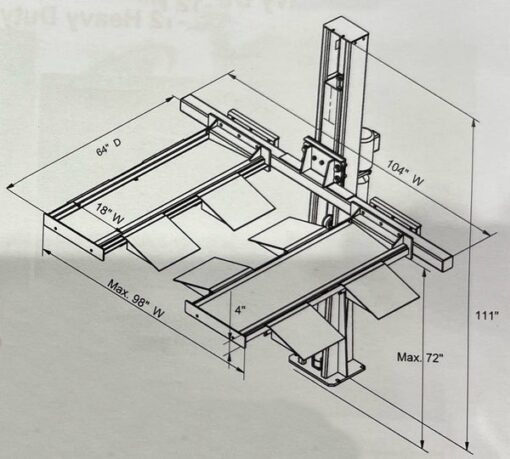This lift needs to be anchored to the floor. 4″ of concrete with a 3,500 lb mix required. The overall foot print is 9′ 4″ high, 8′ 7″ wide, 7′ deep, and has a maximum lifting height of 72″ and maximum lifting capacity of 2,000 lbs. The runways extend out to 8′ 4″ wide and are 5′ deep.